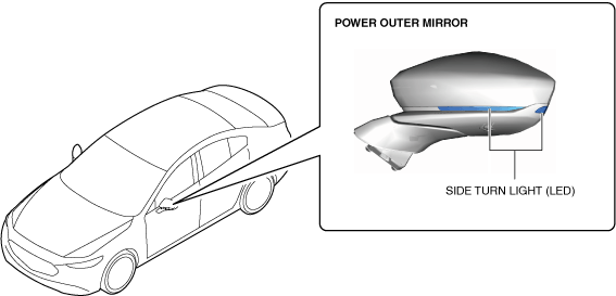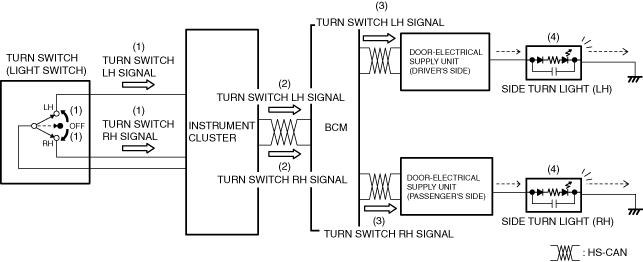 1. When the turn switch is in the LH or RH position, the instrument cluster detects (1) a turn switch LH signal or turn switch RH signal.2. The instrument cluster sends (2) the turn switch LH signal or turn switch RH signal to the body control module (BCM) via CAN communication.3. When the body control module (BCM) receives the turn switch LH signal or turn switch RH signal with the ignition switched ON (engine off or on), it sends (3) a turn switch LH flash request signal or turn switch RH flash request signal to the door-electrical supply unit via CAN communication.4. When the door-electrical supply unit receives the turn switch LH flash request signal or turn switch RH flash request signal, it flashes (4) the side turn light (LH) or side turn light (RH).