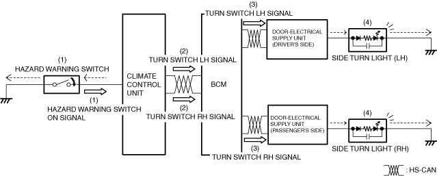 1. When the hazard warning switch turns on, the instrument cluster detects (1) a hazard warning switch on signal.2. The instrument cluster sends (2) the hazard warning switch on signal to the instrument cluster via CAN communication as a turn switch LH signal and turn switch RH signal.3. When the body control module (BCM) receives the turn switch LH signal and turn switch RH signal, it sends (3) a turn switch LH flash request signal and turn switch RH flash request signal to the door-electrical supply unit via CAN communication.4. When the door-electrical supply unit receives the turn switch LH flash request signal and turn switch RH flash request signal, it flashes (4) the side turn light (LH) and side turn light (RH).