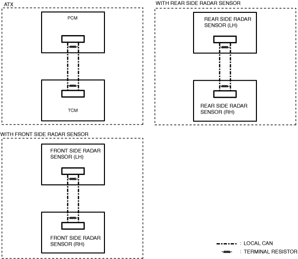 ― Between PCM and TCM― Between front side radar sensor (LH) and front side radar sensor (RH)― Between rear side radar sensor (LH) and rear side radar sensor (RH)