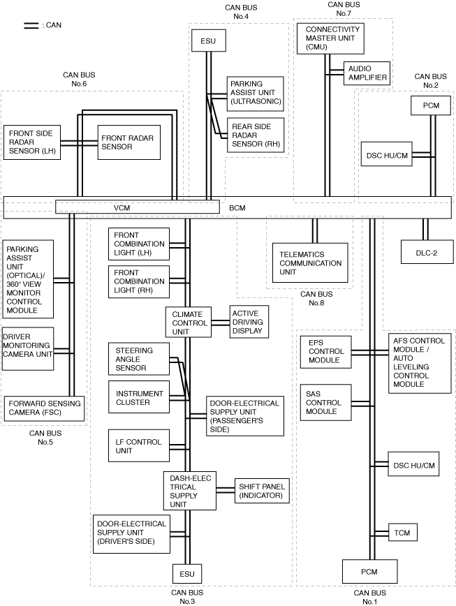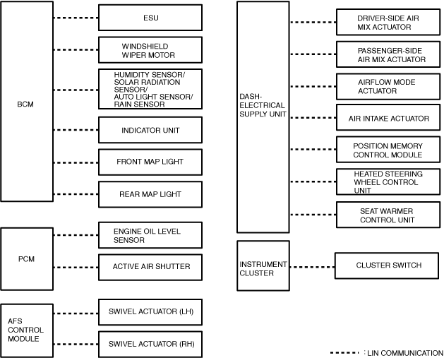 ― Between BCM and electrical supply unit (ESU)― Between BCM and windshield wiper motor― Between BCM and humidity sensor/solar radiation sensor/auto light sensor/rain sensor― Between BCM and indicator unit― Between BCM and front map light― Between BCM and rear map light― Between dash-electrical supply unit and driver-side air mix actuator― Between dash-electrical supply unit and passenger-side air mix actuator― Between dash-electrical supply unit and airflow mode actuator― Between dash-electrical supply unit and air intake actuator― Between dash-electrical supply unit and heated steering wheel control unit― Between dash-electrical supply unit and position memory control module― Between dash-electrical supply unit and seat warmer control unit― Between PCM and engine oil level sensor― Between PCM and active air shutter― Between adaptive front lighting system (AFS) control module and swivel actuator (LH)― Between adaptive front lighting system (AFS) control module and swivel actuator (RH)― Between instrument cluster and cluster switch