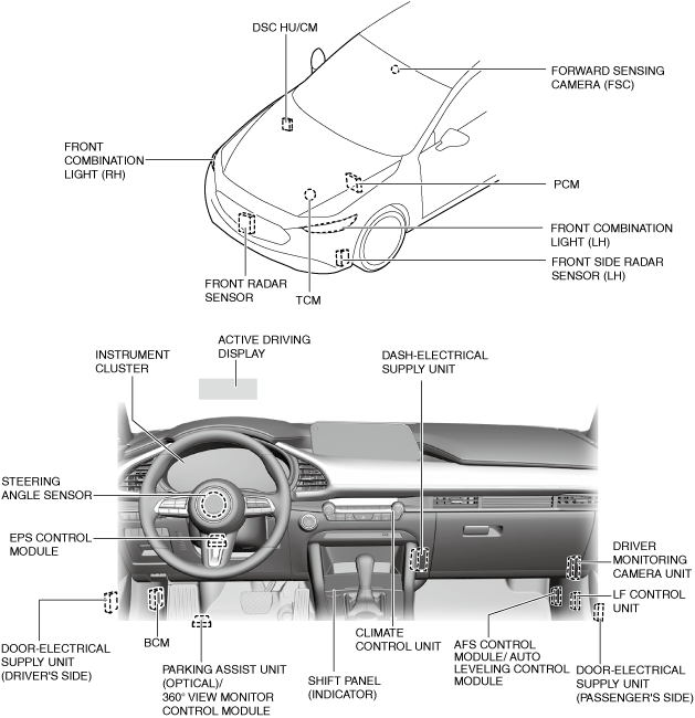 ― BCM― Parking assist unit (optical)/360° view monitor control module― Driver monitoring camera unit― Forward sensing camera (FSC)