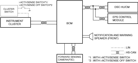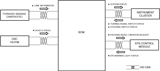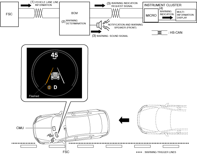 1. The forward sensing camera (FSC) sends the vehicle lane line information (1) to the body control module (BCM).2. When the body control module (BCM) receives the vehicle lane line information (1) from the forward sensing camera (FSC), it determines (2) the warning sound and the warning indication.3. If the body control module (BCM) determines that the warning sound and the warning indication are needed, it sends (3) the warning indication request signal to the instrument cluster, and outputs (3) the warning sound signal to the Notification and Warning Speaker (Front).4. When the instrument cluster receives the warning indication request signal from the body control module (BCM), it displays (4) the warning indication in the multi-information display.