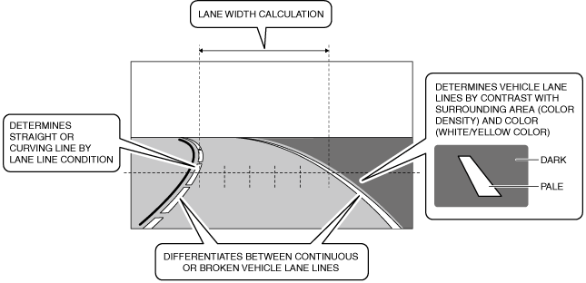 • The forward sensing camera (FSC) recognizes lineal objects which are white/yellow and paler than the surrounding color as vehicle lane lines by the contrast (color density) of the camera image.• If the vehicle lane lines are continuous they are recognized as actual lines and if discontinuous they are recognized as broken lines.• The travel lanes recognized from the vehicle lane lines on the left and right of the vehicle are used to calculate the width.• Traveling in a straight line or cornering is determined by the status of the vehicle lane lines.