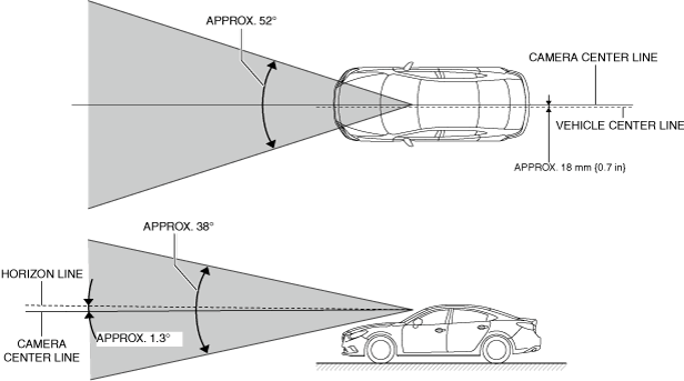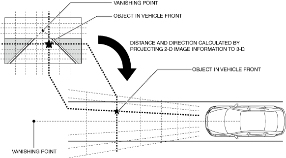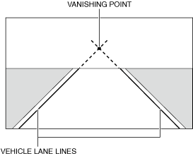 • The forward sensing camera (FSC) adjusts the camera shot angle by aiming, and stores the vanishing point *1. The stored vanishing point and the current vanishing point are compared and if there is a deviation of a certain value or more in the vanishing point, the current vanishing point is stored as the new vanishing point.