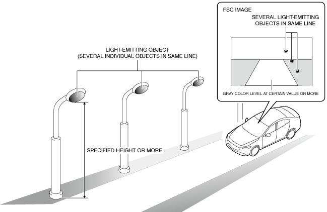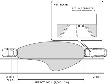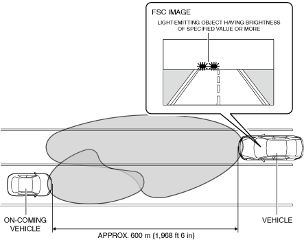 • The forward sensing camera (FSC) recognizes a light-emitting object which meets any of the following conditions and is at least within 600 m {1,968 ft 6 in} from the monitoring vehicle as an on-coming vehicle.