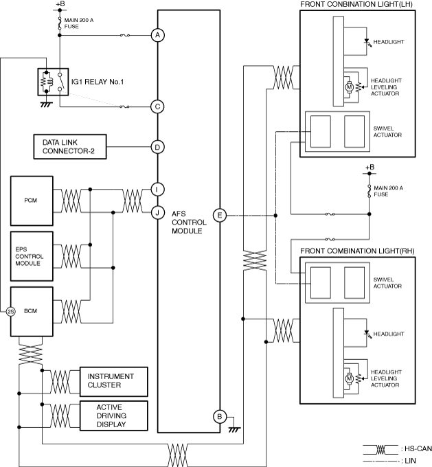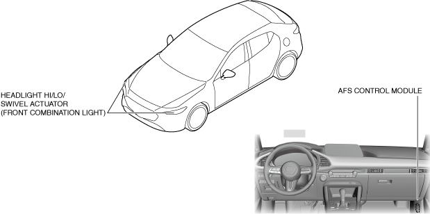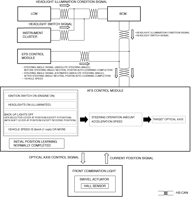 • The adaptive front lighting system (AFS) control module changes the optical axis to the direction in which the vehicle is travelling according to the steering wheel operation and vehicle speed while the headlights are turned on.• The adaptive front lighting system (AFS) control module controls the swivel function based on the following CAN signals.