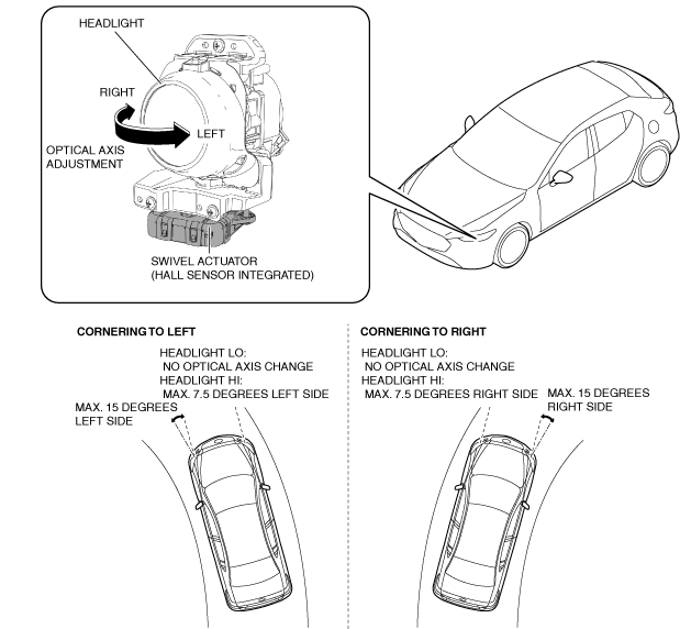 • The swivel actuator drives the motor based on the signal from the adaptive front lighting system (AFS) control module.• Changes in the swivel angle of the headlights are detected by the Hall sensor and input to the adaptive front lighting system (AFS) control module.