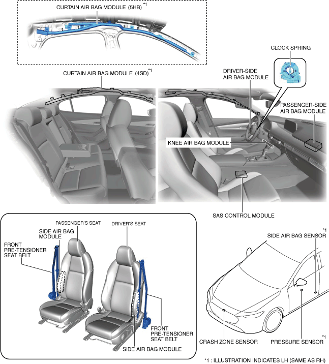 ― Install the radio set and its antenna as far away as possible from the control modules and control unit.― The antenna feeder and power cable generate radio waves, therefore, keep them 100 mm {3.94 in} or more from the control modules, control unit, and wiring harness. If the antenna feeder and power cable cross over the wiring harness, place them perpendicular to the wiring harness.― Do not install a high output radio set.― Do not use the control modules and control unit power source for the radio set. In addition, do not use the cigar lighter and accessory socket power source.― Do not attach the antenna feeder or wiring harness of the radio set to the wiring harness, fuel pipe, or brake tube of the vehicle.― Do not install any radio set-related devices in the area where the air bag module deploys to prevent a secondary accident if the air bag were to deploy.