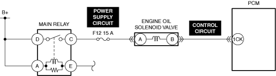 • If the PCM detects that the engine oil solenoid valve control voltage at the PCM terminal 1CK is specified value or less for 2 s with the following condition met, the PCM determines that the engine oil solenoid valve circuit voltage is low.
