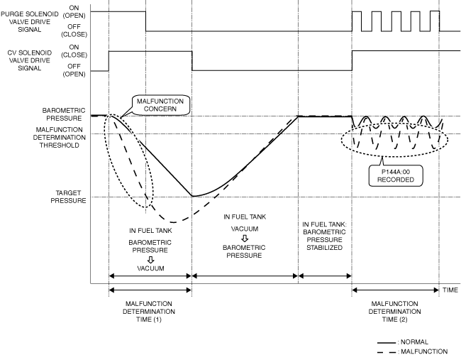 • The PCM closes the purge solenoid valve and CV solenoid valve while the vehicle is being driven and seals the fuel tank. Then, gas in the fuel tank is inducted into the intake manifold and the pressure in the fuel tank is decreased by opening the purge solenoid valve, and the pressure change in the fuel tank is measured using the fuel tank pressure sensor. If the pressure in the fuel tank decreases below the target negative pressure during the specified period from the pressure measurement (malfunction determination time (1)), positive pressure is inducted to the fuel tank via the intake manifold by closing the purge solenoid valve and opening the CV solenoid valve. After positive pressure is inducted to the fuel tank, the fuel tank is sealed, opening/closing of the purge solenoid valve is performed repeatedly, and the pressure change in the fuel tank is monitored at that time (malfunction determination time (2)). If the amount of pressure change veers towards negative pressure exceeding the malfunction determination threshold, the PCM determines that there is clogging between the fuel tank pressure sensor and fuel tank, and stores a DTC.