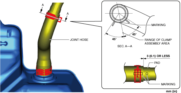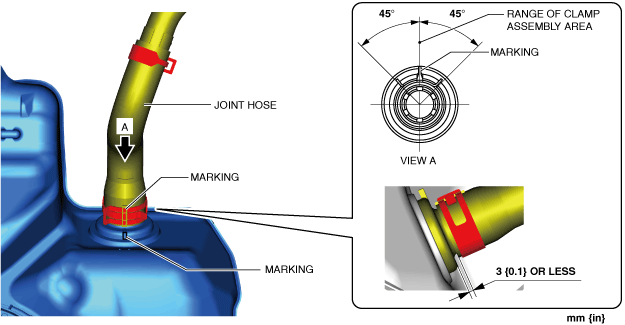 2.Align the joint hose marking with the fuel-filler pipe marking as shown in the figure and assemble.