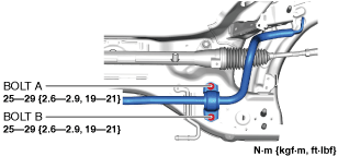 • If the steering wheel rotates after the steering shaft and the steering gear under carriage are disconnected, the internal parts of the clock spring could be damaged. After disconnecting the steering shaft, secure the steering wheel using tape or cable to prevent it from rotating.• Install the front stabilizer being careful of the following so as not to decrease the functionality of the front stabilizer.