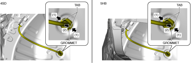 11.Press the grommet tabs in the direction of arrows (1) shown in the figure and detach them from the vehicle body.