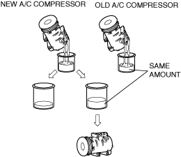 1.Rotate the new A/C compressor shaft six to eight revolutions while pouring refrigerant oil into a clean measuring container. Use this refrigerant oil to refill the new compressor. Do not allow refrigerant oil to become contaminated.