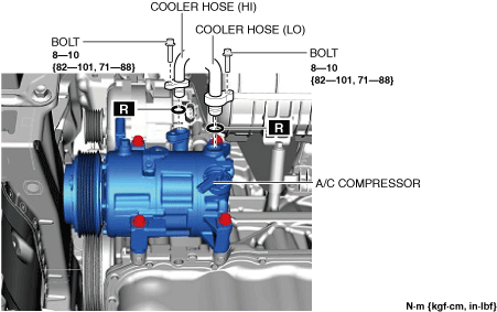 7.Disconnect the cooler hose (HI). Do not allow compressor oil to spill.