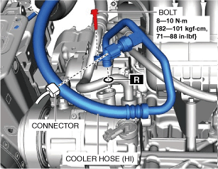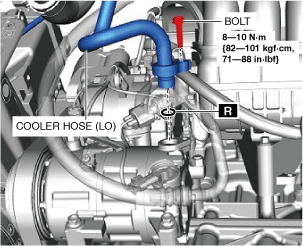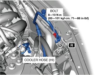 6.Disconnect the cooler hose (HI). Do not allow compressor oil to spill.