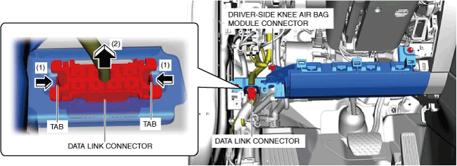 5.Remove the data link connector in the direction of arrow (2) while detaching the tabs in the direction of arrows (1).