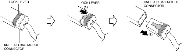 1.Pull out the knee air bag module connector lock lever in the direction of arrow (1) shown in the figure.