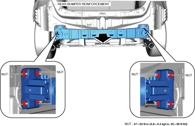 • Remove the rear bumper reinforcement installation nuts using two people, one person supports the rear bumper reinforcement. If all the rear bumper reinforcement installation nuts are removed without supporting the rear bumper reinforcement, it may fall off and be damaged.
