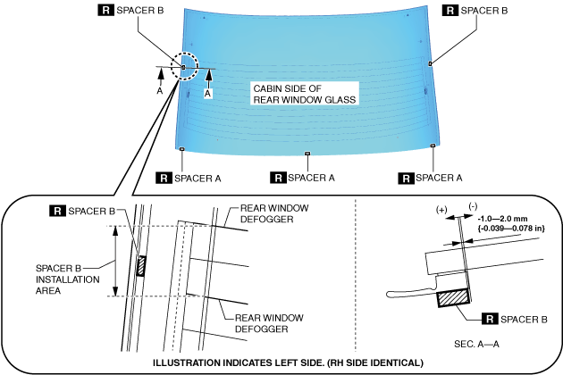 • Proper installation of the glass may be difficult if sealant is cracked or the glass is pushed out by air pressure when a door is opened/closed with all the window glass closed. Keep the door glass open until the rear window glass installation is completed.