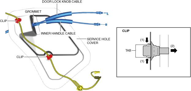 8.Pull the door lock knob cable and the inner handle cable from the service hole cover.