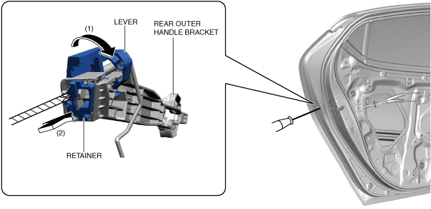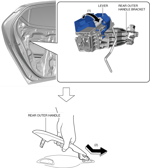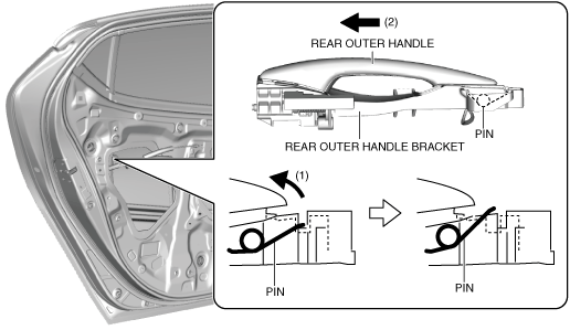 10.While pressing the rear outer handle bracket pin in the direction of arrow (1) shown in the figure, pull the rear outer handle in the direction of arrow (2) and detach the rear outer handle bracket pin from the rear outer handle.