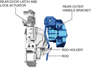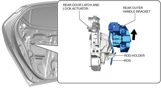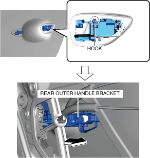 17.Pull the rear outer handle bracket in the direction of the arrow shown in the figure and detach the rear outer handle bracket hook from the body.