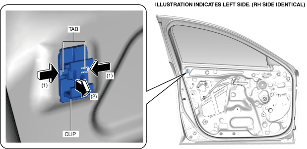 10.While pressing the tabs of the clip in the directions of arrows (1) shown in the figure, pull the clip in the direction of arrow (2) to remove the clip from the front door.