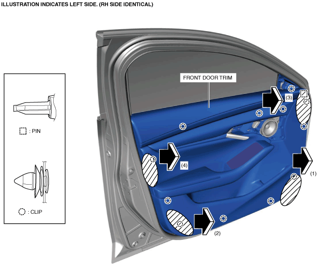6.Hold each shaded area and pull the front door trim in the order of arrows (1), (2), (3), and (4), and detach the clips and pin.
