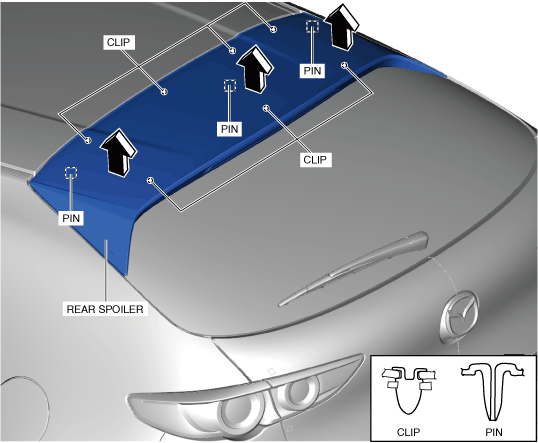 12.Pull the rear spoiler in the direction of the arrows and remove it while detaching the pins and clips.