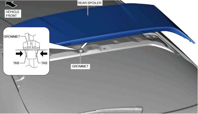 13.While holding the rear spoiler by hand, press the tabs of the grommet from the underside of the liftgate shown in the figure, and disengage the grommet tabs from the liftgate.
