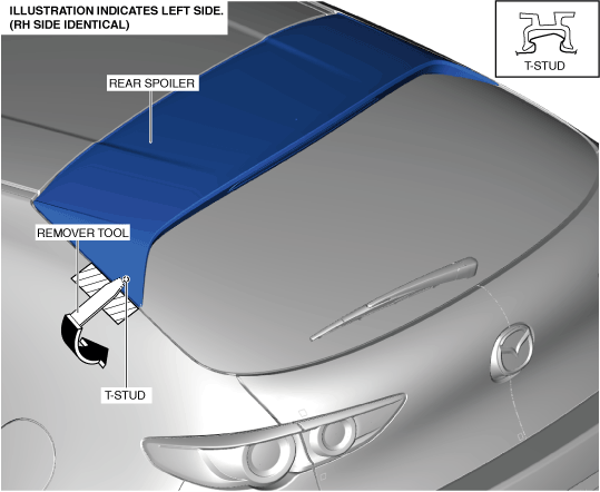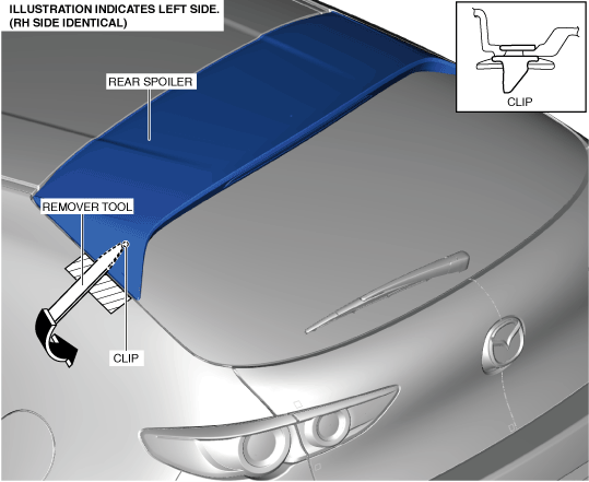 • When replacing the rear spoiler, remove the high-mount brake light. (See HIGH-MOUNT BRAKE LIGHT REMOVAL/INSTALLATION.)• When replacing the rear spoiler, remove the weatherstrip.