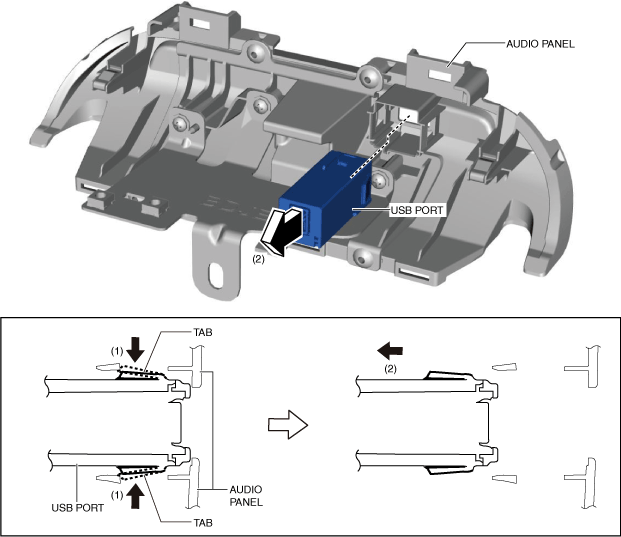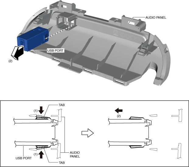 3.While pressing the tabs of the USB port in the direction of arrows (1) shown in the figure, move the USB port in the direction of arrow (2) and detach the tabs of the USB port from the audio panel.