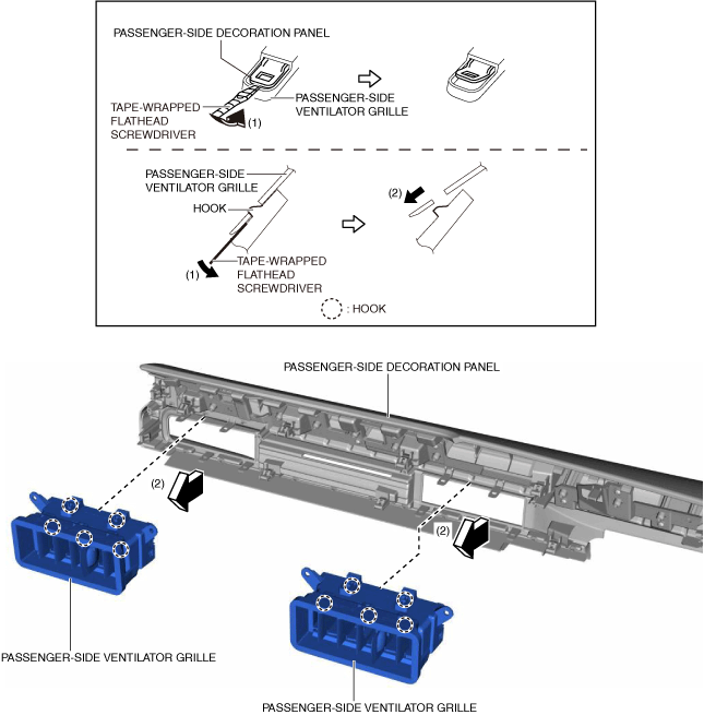 3.Using a tape-wrapped flathead screwdriver, move it in the direction of arrow (1) shown in the figure and while detaching the hook from the passenger-side decoration panel, slide the passenger-side ventilator grille in the direction of arrow (2) to remove it.