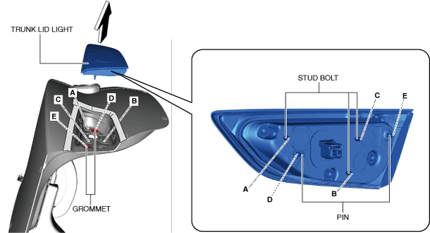 • When removing the trunk lid light from the trunk lid, the trunk lid light could fall off and be damaged. When removing the trunk lid light from the trunk lid, hold the trunk lid light on the lens side with a hand.