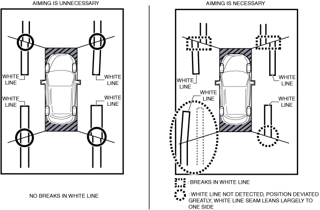 • When any of the following operations is performed, it is necessary to verify if the front camera aiming, side camera aiming, and rear mount camera aiming needs to be performed.