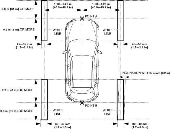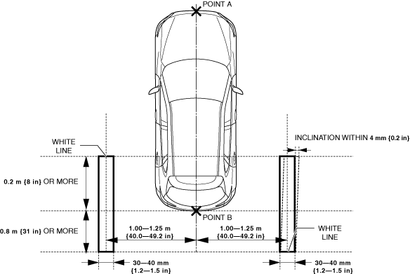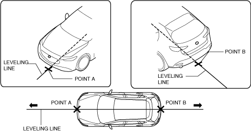7.Pull the leveling line towards the front and rear of the vehicle and adjust it so that it passes over points A and B.