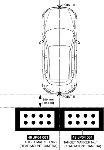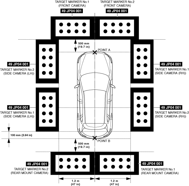 • For the 360° view monitor system aiming (batch aiming), 4 sets(1 set/2 targets) of the SST (49 JP04 001) are required. If 4 sets of the SST (49 JP04 001) is unavailable, perform the aiming for the 4 cameras individually.