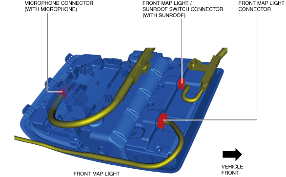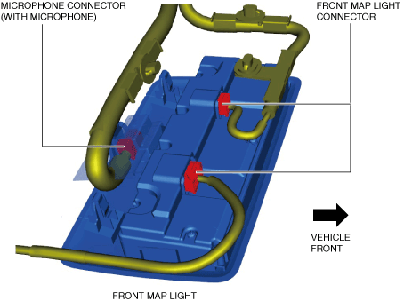 • Be careful not to pull the connector out strongly when removing the front map light. Otherwise, the contact surface of the wiring harness secured to the headliner will come off and the wiring harness could be pulled out. If the front map light is installed with the wiring harness pulled out, the wiring harness could get caught between the headliner and front map light bracket resulting in an open or short circuit in the wiring harness.