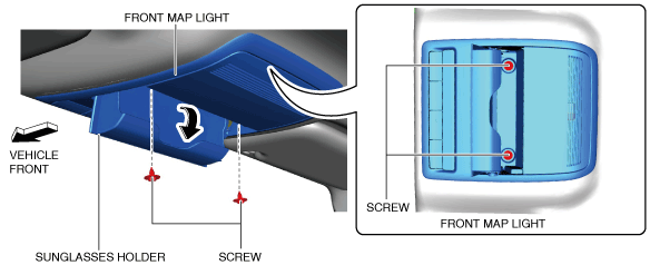 3.Move the front map light in the direction of the arrow shown in the figure and pull out the front map light from the headliner.