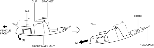 2.Pull out the front map light rear part in the direction of the arrow shown in the figure and detach the clips and tabs from the bracket.