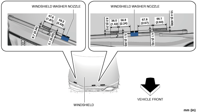 1.Insert the remover tool into the adjustment holes of the windshield washer nozzle and adjust the area where washer fluid is sprayed as shown in the figure.