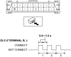 5.Using a jumper wire, connect DLC-2 terminals B and J (ground) three times at 0.5—1.5 s intervals as shown in the figure.