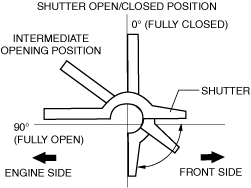 • When the intake air temperature is -5 °C or less, the PCM opens the shutter to 90° (fully open position) to prevent the engine oil temperature from increasing rapidly.• By opening the shutter, a rapid increase in engine oil temperature is suppressed to prevent the blow-by gas from freezing and adhering to the throttle valve.