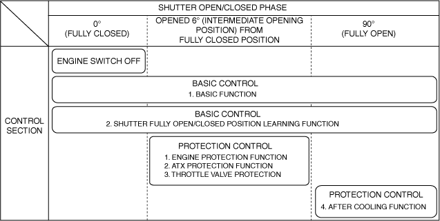 • For ATX protection, when the PCM receives a cooling fan operation request signal from the TCM, the PCM opens the shutter to 90° (fully open position) until the ignition is switched off to prevent the ATF temperature from being excessively high, and also to lower the frequency of fail-safe operations which operate when the ATF temperature is high.