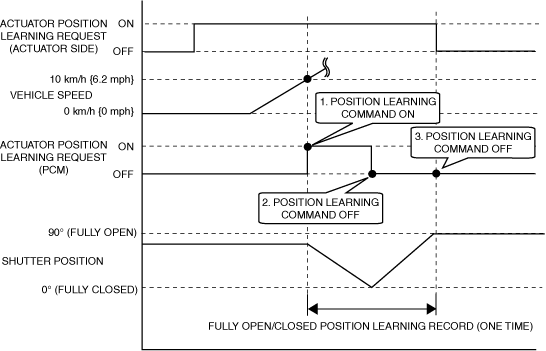 1. When the vehicle speed is 10 km/h or more after the ignition is switched ON, and there is a position learning request from the actuator, the PCM outputs a position learning command to the actuator.2. The actuator itself moves the shutter to 90° (fully open position) or 0° (fully closed position).3. After the shutter reaches 0° (fully closed position), the PCM turns off the position learning command and the actuator itself moves the shutter to 90° (fully open position).4. When the shutter reaches 90° (fully open position), the shutter fully open/closed position learning function is completed and the position learning request from the actuator turns off.