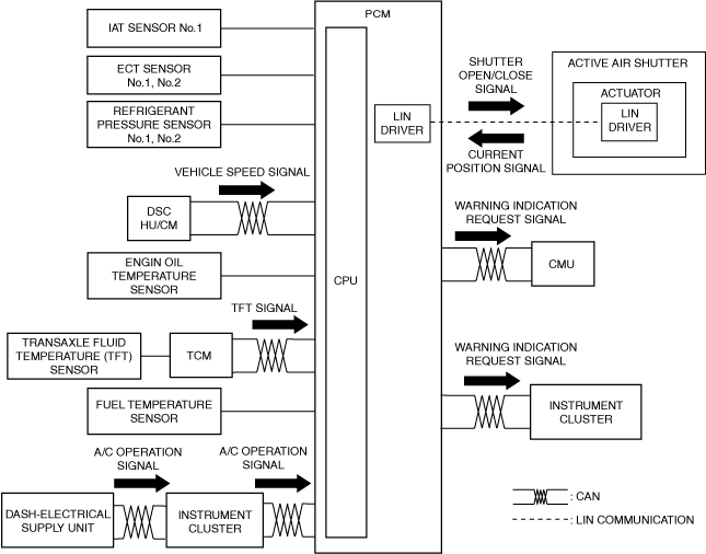 • After the main relay turns off (specified time has elapsed since ignition is switched OFF), the PCM commands a write of the shutter fully open/closed position learning value recorded in the active air shutter actuator to the non-volatile memory in the actuator.