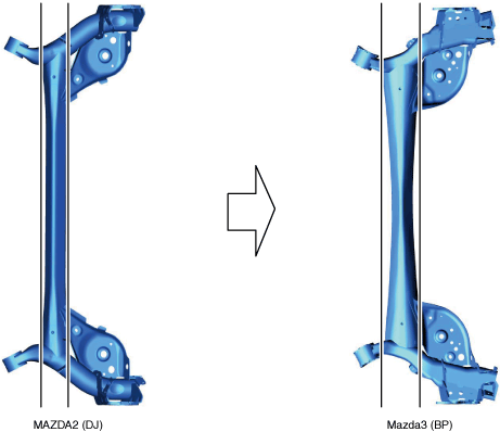 • By adopting a beam with a cross section having differing diameters, the rigidity of both ends of the beam has been improved. As a result, changes in toe and camber are suppressed while driving. (2WD)
