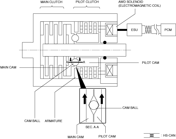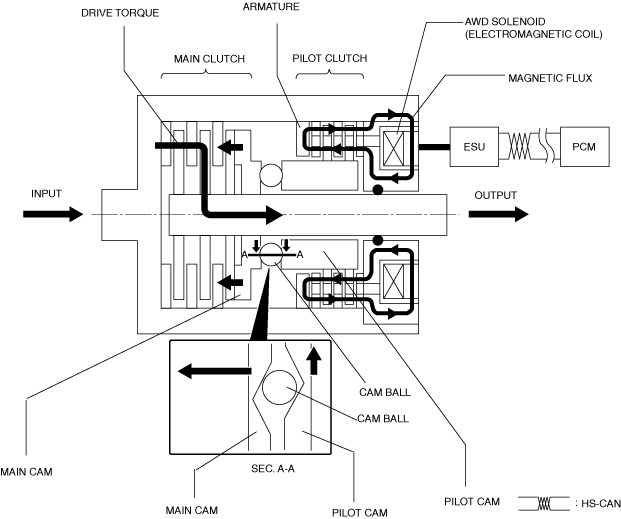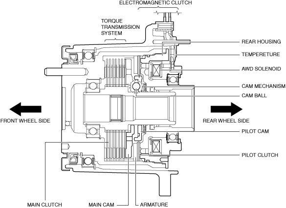 • The amount of push force exerted on the main clutch by the main cam (that is, the strength of the drive torque transmitted to the rear wheels) changes in accordance with the proportion of the force acting upon the pilot cam, engaged with the pilot clutch.• Therefore, by changing the periodicity of the electric current from the AWD CM to the AWD solenoid (ON/OFF rate of the AWD solenoid = force acting on the pilot cam), the module controls the transmission of drive torque to the rear wheels.