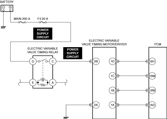 ― Perform an inspection of the connectors and wiring harnesses between the battery positive terminal and electric variable valve timing relay and the electric variable valve timing motor/driver.